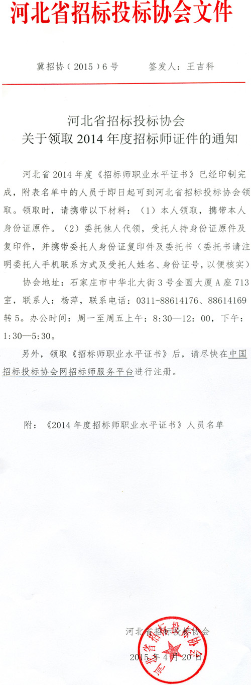 摘要 河北省招標投標協(xié)會發(fā)布:河北2014年招標師合格證書領(lǐng)取通知