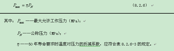 5. 鋼絲網(wǎng)PE塑料管道水溫在20℃以上時(shí),管材最大允許工作壓力應(yīng)按(8.2.6)公式進(jìn)行計(jì)算: