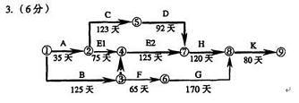 方案三,租賃設(shè)備安裝調(diào)試l0天,不超過(guò)E的總時(shí)差(或不影響工期),但增加費(fèi)143 750元(350元/天×125天=43750元)。(2分)