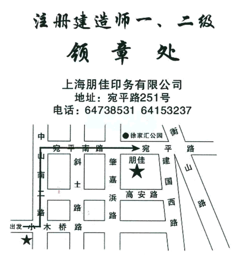 上海朋佳印務(wù)有限公司因房屋租賃到期,現(xiàn)由原地址高安路33號(hào)搬遷至宛平路251號(hào),請(qǐng)2010年11月1日以后領(lǐng)取一級(jí)、二級(jí)注冊(cè)建造師圖章的人員到新地址辦理。上海朋佳印務(wù)有限公司原電話號(hào)碼不變。