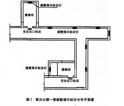 22、在對(duì)某建筑高度為67.6m的一類(lèi)高層辦公樓的疏散指示標(biāo)志和應(yīng)急照明驗(yàn)收時(shí),工作人員通過(guò)現(xiàn)場(chǎng)測(cè)量畫(huà)出了一層疏散指示標(biāo)志的分布草圖,如圖2所示。另外,檢查中發(fā)現(xiàn)的消防應(yīng)急燈具離地面1.5m,通過(guò)插頭與供電線(xiàn)路連接,分配線(xiàn)路采用燃燒性能為B1級(jí)的電纜明裝;系統(tǒng)的應(yīng)急轉(zhuǎn)換時(shí)間為6s。請(qǐng)分析該建筑物疏散指示標(biāo)志和應(yīng)急照明設(shè)置的不妥之處。