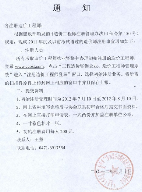 內蒙古2011年及以前考試的造價工程師注冊事宜通知