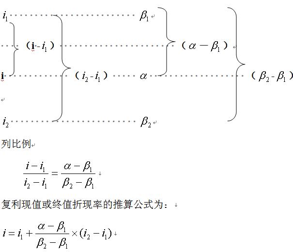 若所求的折現(xiàn)率為i,對應的復利現(xiàn)值或終值系數(shù)為α;i1、i2分別為與i相鄰的兩個折現(xiàn)率,且i1 則