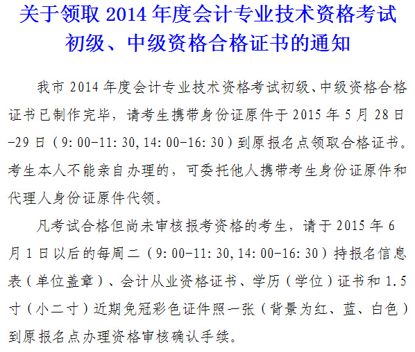 天津2014年中級會計(jì)職稱合格證書領(lǐng)取時間5月28日-29日