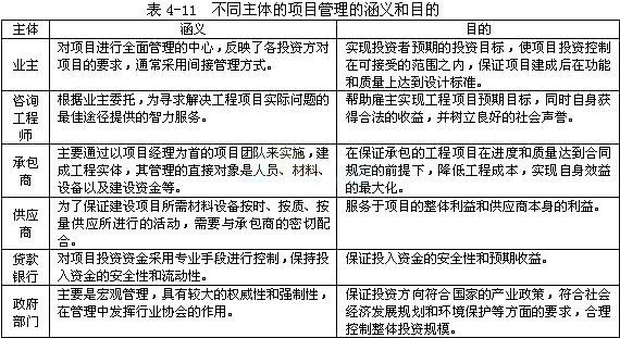 項(xiàng)目管理的主體是項(xiàng)目管理者,主要涉及到業(yè)主、咨詢工程師、承包商、供應(yīng)商、貸款銀行和政府部門等。