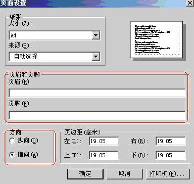 二、將頁面設(shè)置窗口中‘方向’內(nèi)容選擇為‘橫向’,頁眉和頁腳下輸入框內(nèi)容刪除
